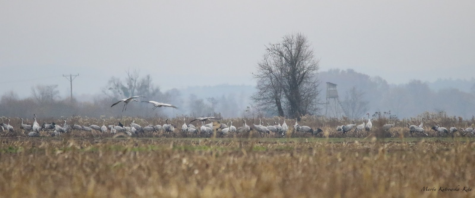 Zatrzymałam się na dłuższą chwilę, wiatr smagał mi twarz i pchał włosy do oczu przy próbie wycelowania obiektywem w potężne stado żurawi.